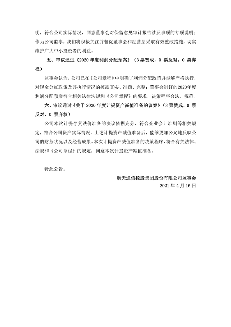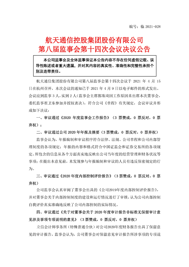 航天通信控股集團(tuán)股份有限公司八屆十四次監(jiān)事會決議公告