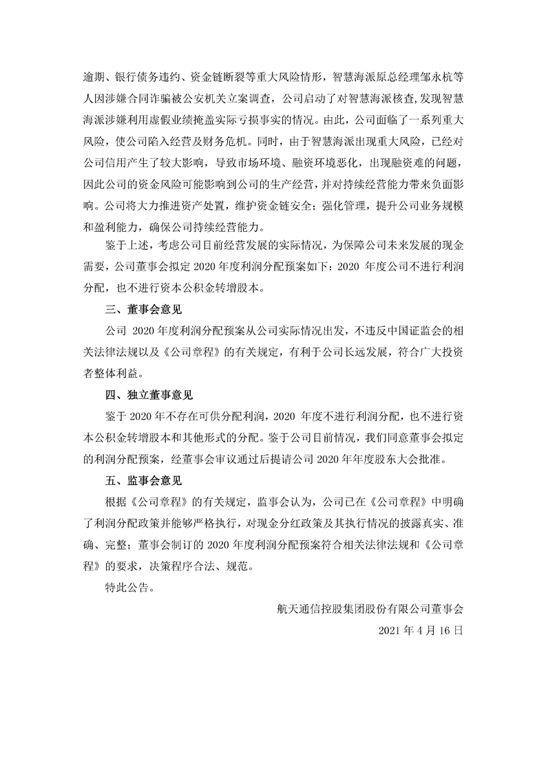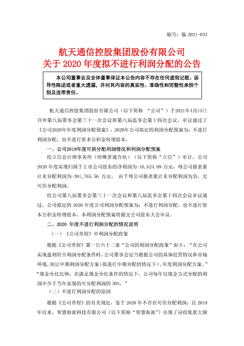 航天通信控股集團股份有限公司關(guān)于2020年度擬不進行利潤分配的公告