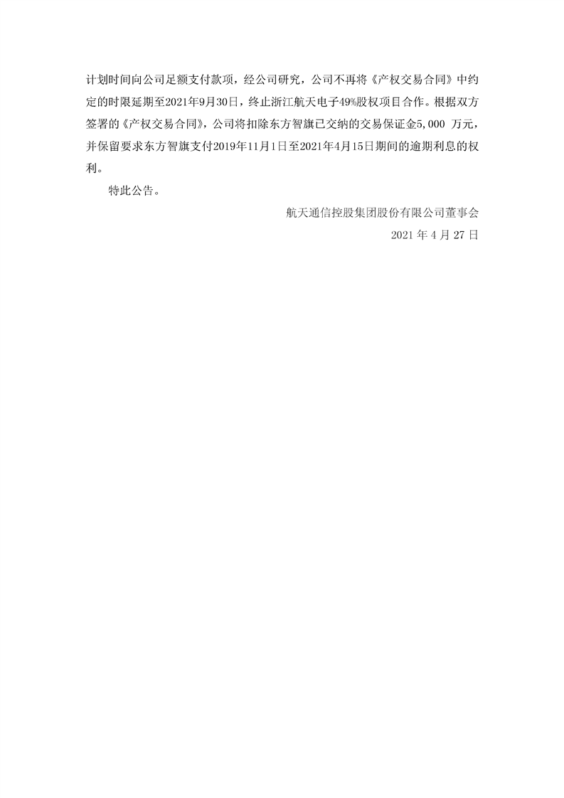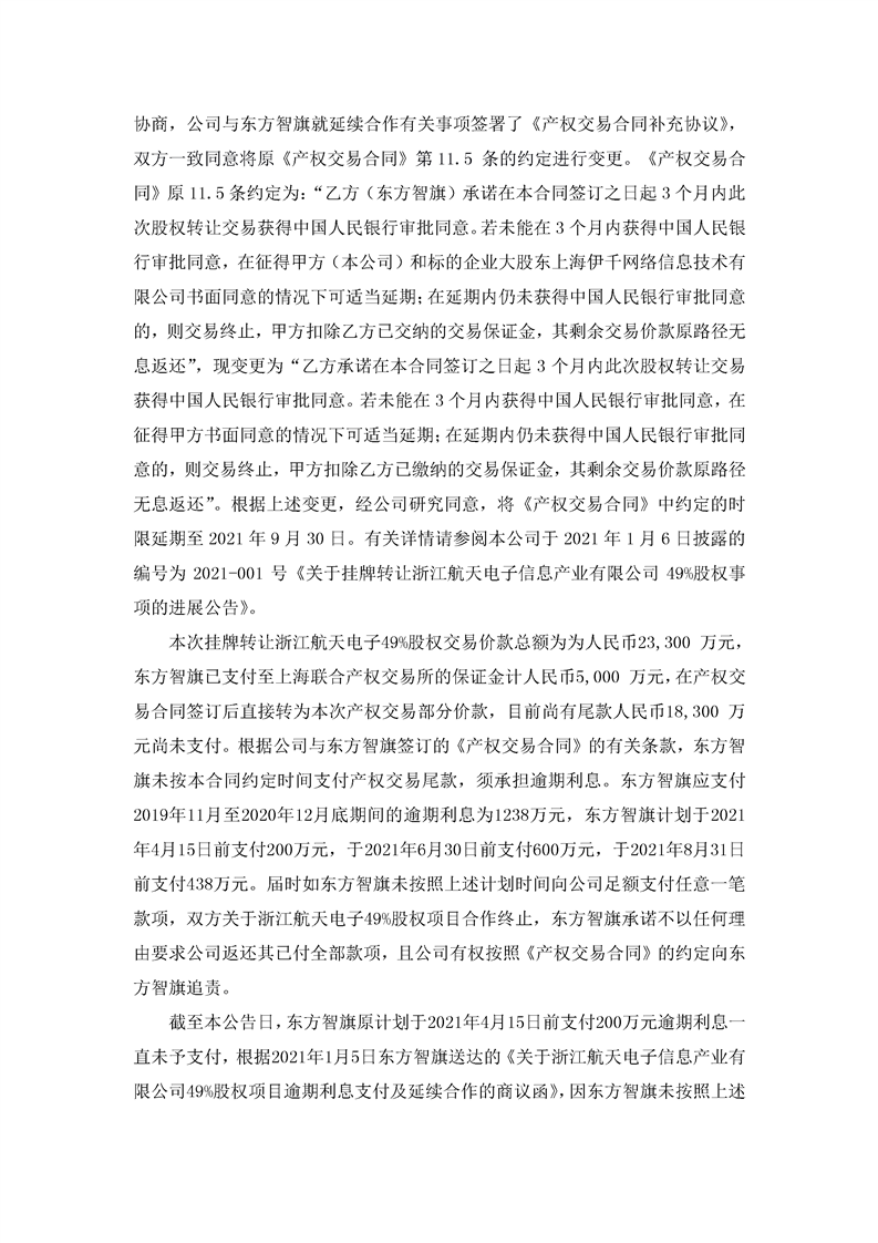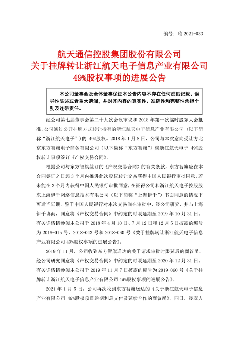 航天通信關于掛牌轉讓浙江航天電子信息產(chǎn)業(yè)有限公司49%股權事項的進展公告