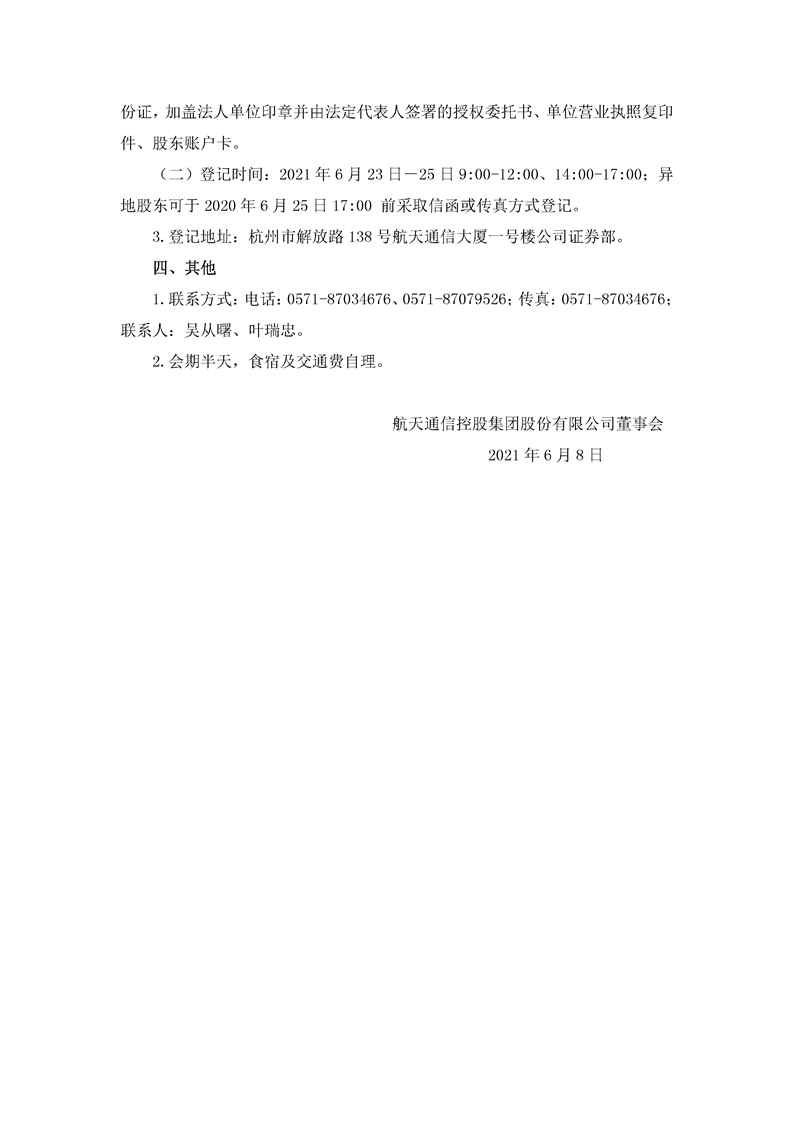 航天通信控股集團股份有限公司關于召開2020年年度股東大會的通知