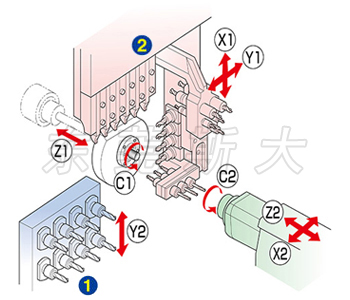 | 四、斯大走心機SR-32JIItypeB橫向鉆孔5軸單元下方2軸,采用模塊化設計,可根據工件需要自由安裝可交換式工具,實現工藝的靈活性,通過功能模塊的組合,輕松實現各種變化,以此獲得機床的最佳結構。 | |||