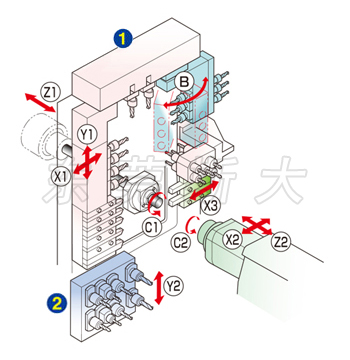 | 四、斯大走心機SR-38typeB為了進一步實現(xiàn)多樣化復合加工,充實了背面?zhèn)鹊墓δ埽瑥亩诒趁娴都芘_配備8軸鉆孔單元,并搭載Y2軸控制作為標配,在刀架臺上備有可通過操作系統(tǒng)控制的角度可變化的B軸動力單元,使得刀具可在工件外圓和端面上任意角度加工傾斜表面。 | |||