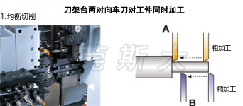 | 三、斯大走心機SR-38typeB采用門型刀架臺采用均等負荷橫向導向結構,抑制直動導軌軸承所受的力矩負重至最小限度,確保刀架臺剛性,并在門型刀架臺的后面排刀座附加X3控制軸,通過X1、X3軸同步控制實現(xiàn)對工件進行均衡切削,抑制工件偏轉實現(xiàn)高精度加工,縮短切削時間。 |