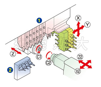 | 四、斯大走心機SB-20RtypeN在標準規格橫向鉆孔單元4軸的基礎上,可配備橫向鉆孔單元5軸型、可交換式橫向鉆孔單元5軸型/5軸高速型4種刀架臺,而可交換式橫向鉆孔單元5軸中的右側3軸及背面4軸單元,采用模塊化設計配備豐富的刀具單元,可根據工件需要自由安裝多種可交換式工具,展開多樣的復合加工。 |