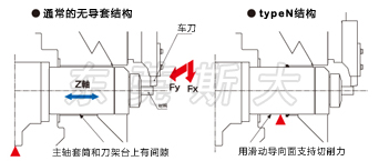 | 二、斯大走心機SB-20RtypeN采用高剛性的“主軸筒滑動導向面構造”無導套結構,在滑動導向面上支持切削力,實現主軸臺的高剛性化。 |